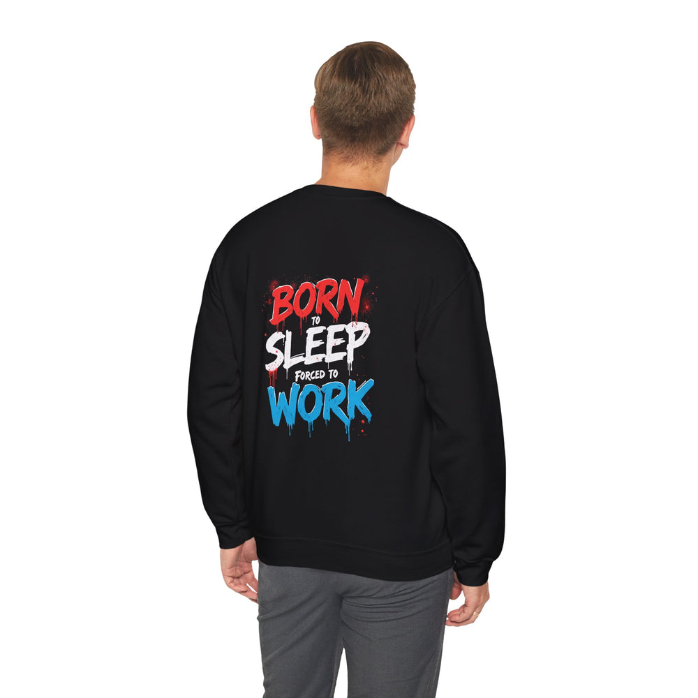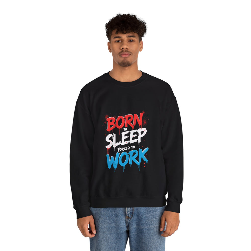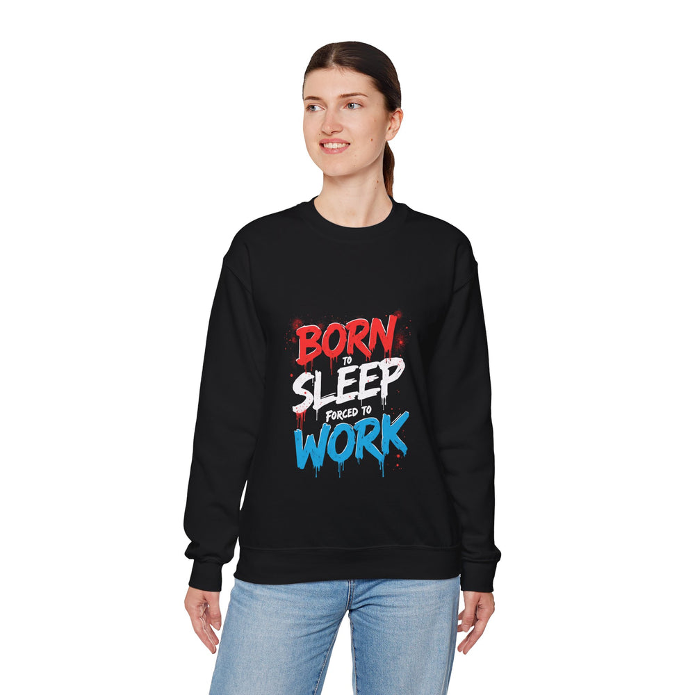 This stylish unisex heavy blend crewneck sweatshirt is the perfect combination of comfort and attitude. The vibrant design boldly states 'Born to Sleep, Forced to Work', making it a fun statement piece for those who appreciate humor in their everyday wear. Its classic fit and soft fabric offer an inviting feel, ideal for lounging around the house, running errands, or casual outings. This sweatshirt is perfect for students, young professionals, or anyone who values comfort blended with a playful vibe. Great for cozy fall days, casual hangouts, or as a light-hearted gift during the holiday season, such as Christmas, birthdays, or any celebration that calls for a laugh.