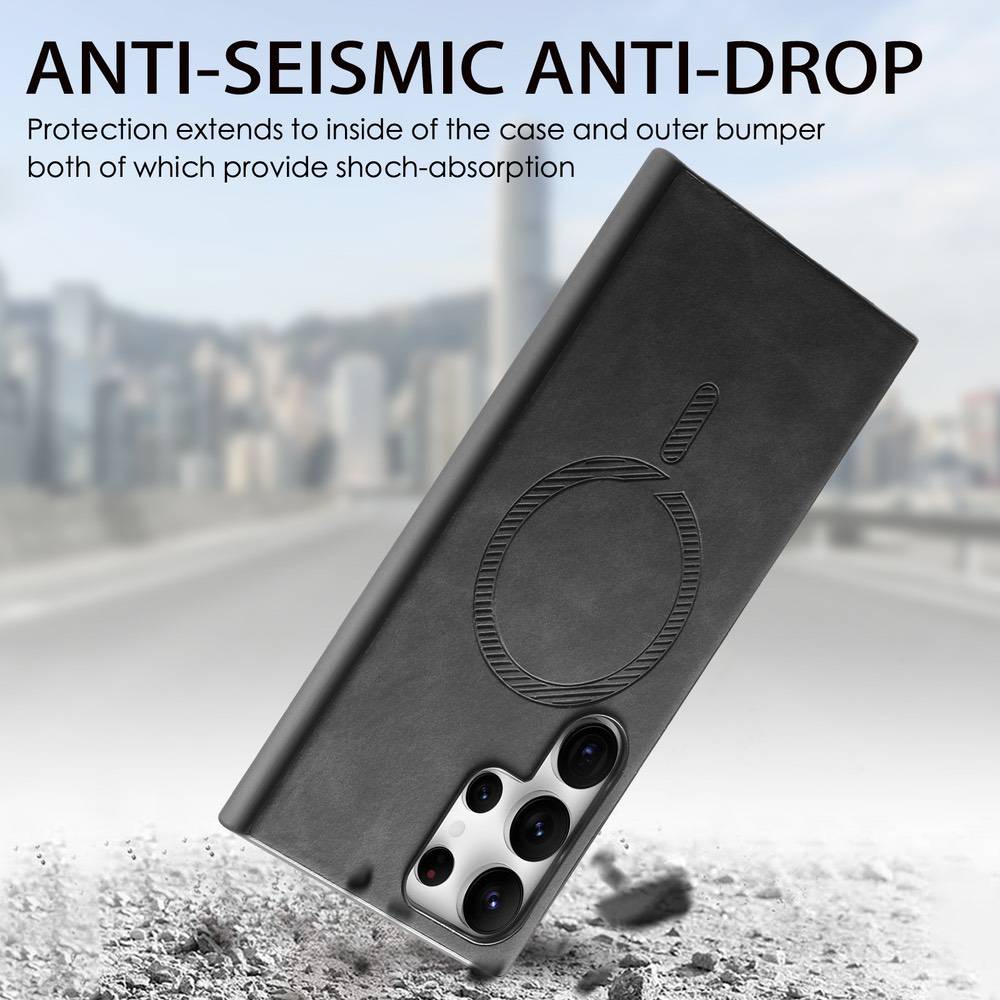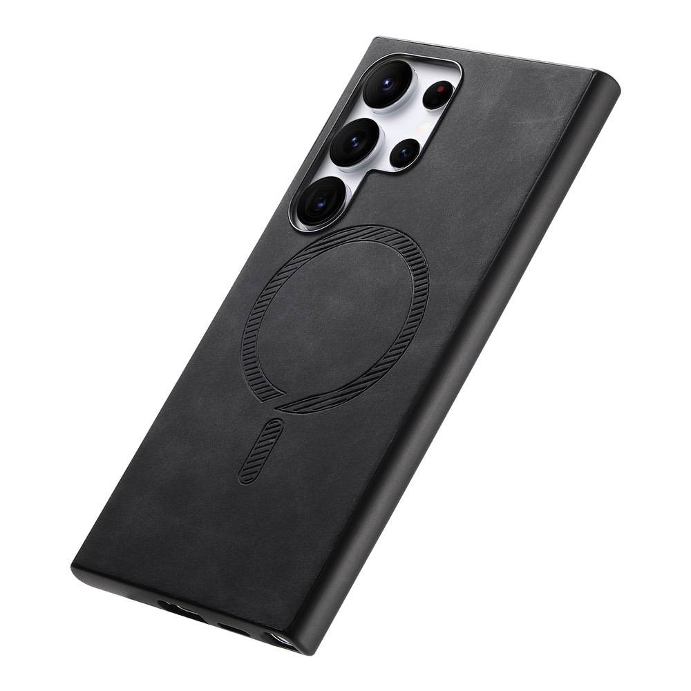 This premium back cover is the perfect fusion of retro style and modern magnetic utility for your Samsung Galaxy S23 Ultra 5G. Crafted from durable, high-quality PU leather, this solid black case provides an elegant, comfortable grip and an elevated aesthetic that stands out. It's the ideal choice for users who value both reliable protection and seamless compatibility with the MagSafe ecosystem. Elevate your phone's look and functionality instantly with this sleek, practical accessory.